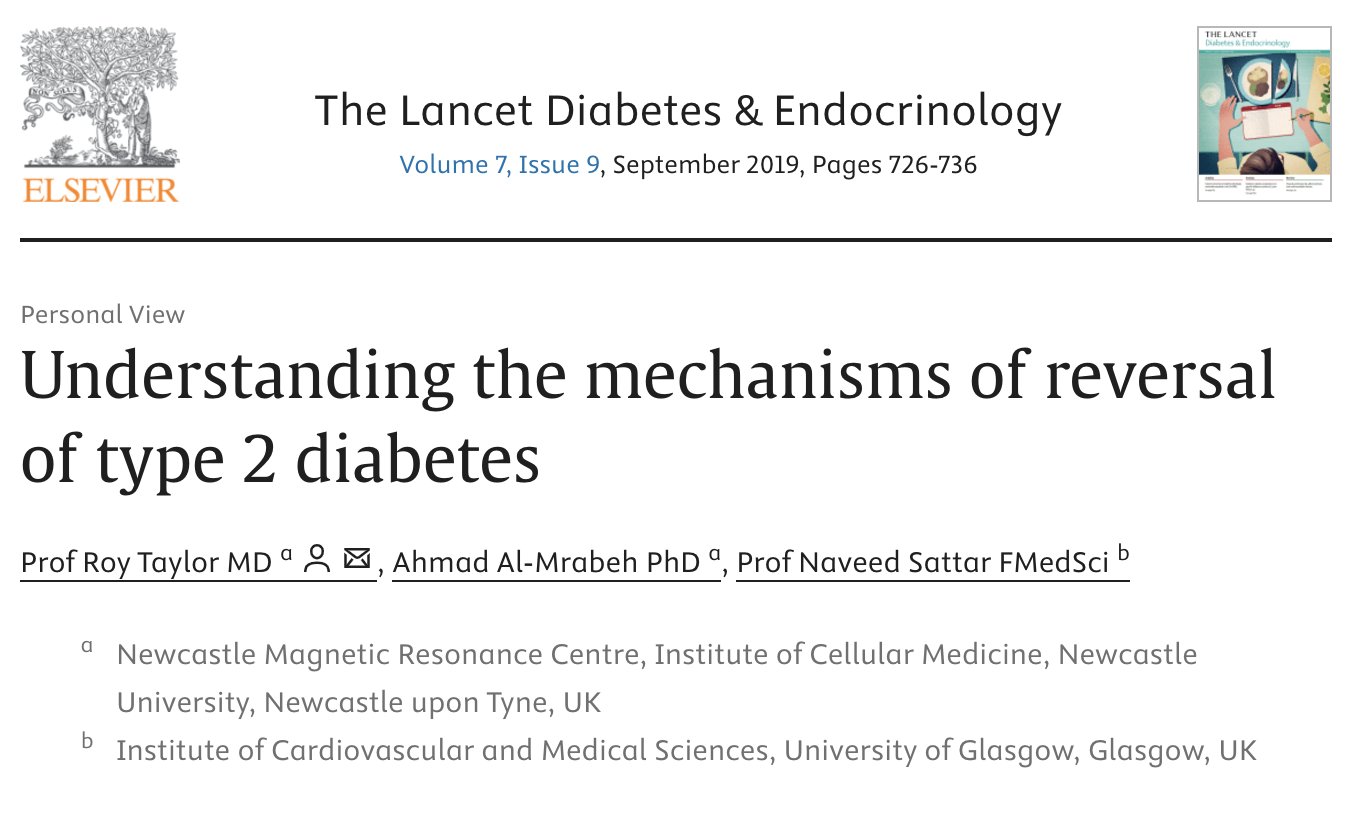 Roy Taylor, Ahmad Al-Mrabeh, Naveed Sattar, Understanding the mechanisms of reversal of type 2 diabetes, The Lancet Diabetes & Endocrinology, Volume 7, Issue 9, 2019, Pages 726-736, ISSN 2213-8587, https://doi.org/10.1016/S2213-8587(19)30076-2