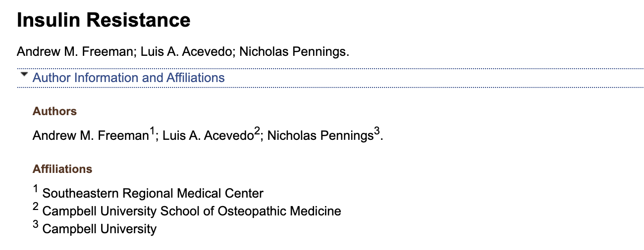 Andrew M. Freeman; Luis A. Acevedo; Nicholas Pennings, Freeman AM, Acevedo LA, Pennings N. Insulin Resistance. [Updated 2023 Aug 17]. In: StatPearls [Internet]. Treasure Island (FL): StatPearls Publishing; 2024 Jan-. Available from: https://www.ncbi.nlm.nih.gov/books/NBK507839/