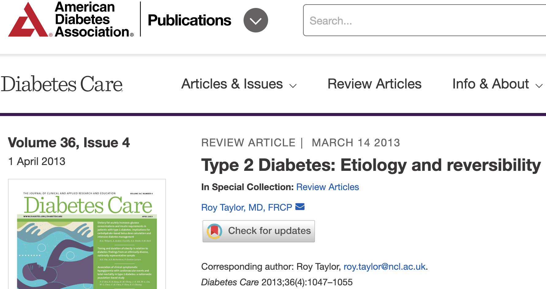 Roy Taylor, "Type 2 Diabetes: Etiology and Reversaility." Diabetes Care 2013; Issue 36 Volume 4: Pages 1047–1055,