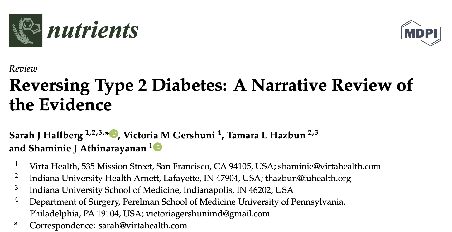 Sarah J Hallberg, Victoria M Gershuni, Tamara L Hazbun, and Shaminie J Athinarayanan. "Reversing Type 2 Diabetes: A Narrative Review of the Evidence" Nutrients, 2019, Volume 11, no. 4: 766. https://doi.org/10.3390/nu11040766